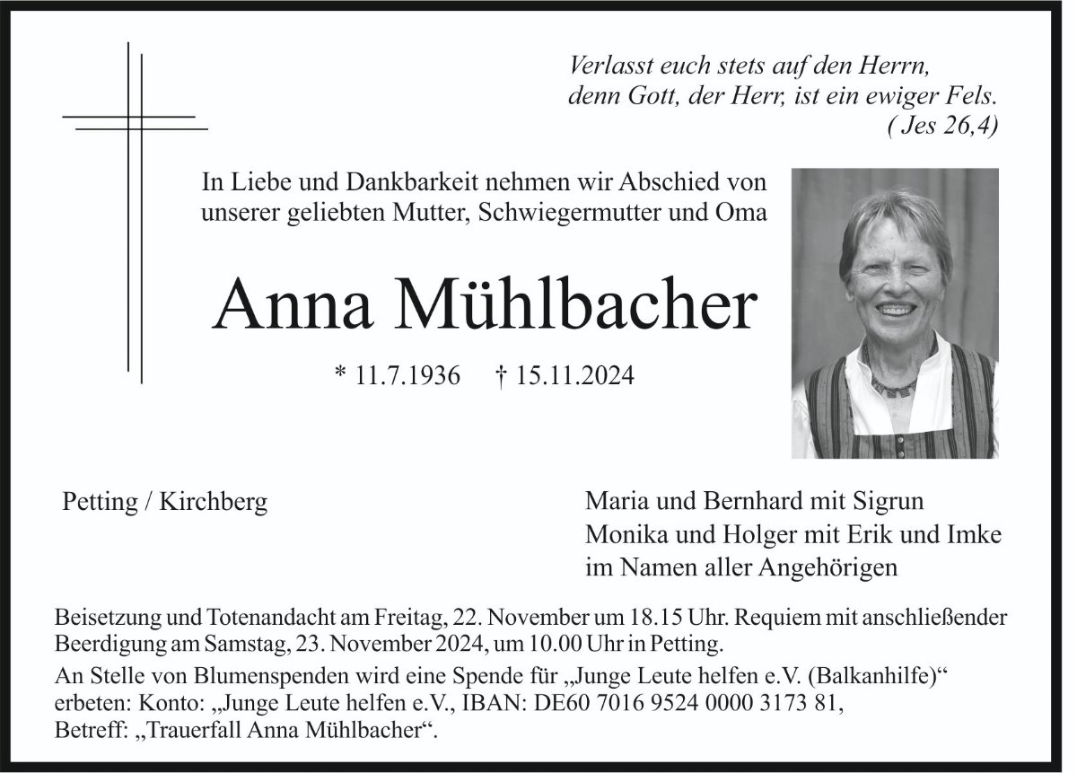 Möge das Andenken an Anna Mühlbacher zum Segen sein für alle, die sie kannten! Möge ihr licht weitergetragen werden!