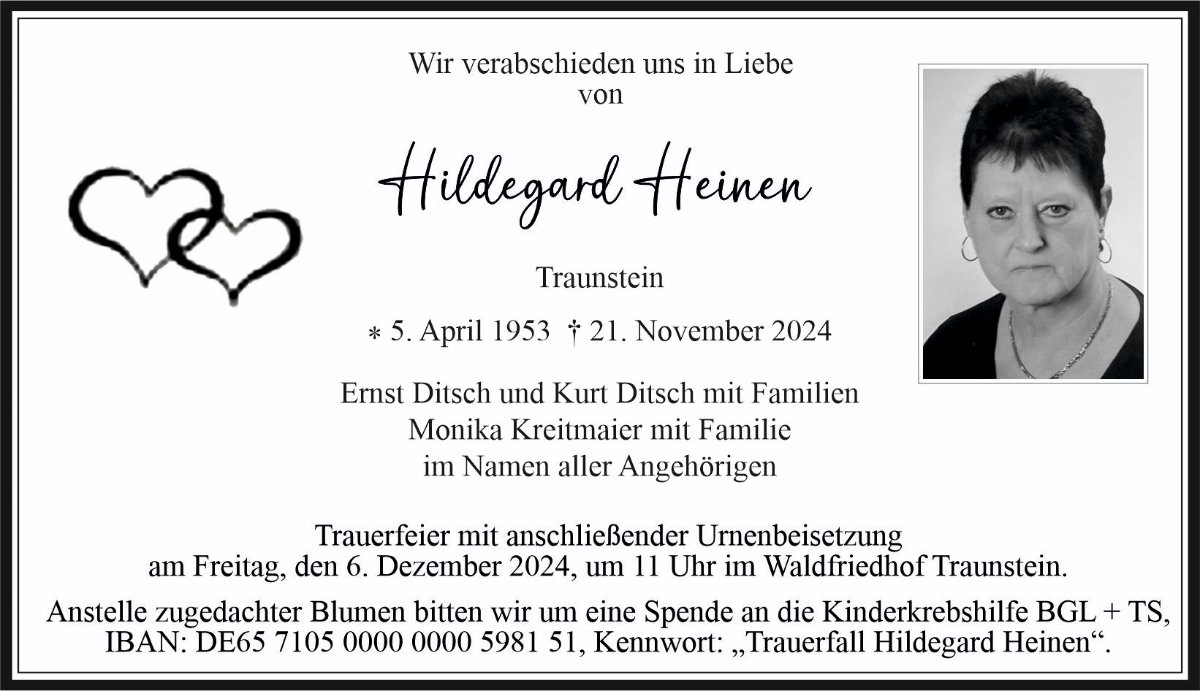 Unsere aufrichtige Anteilnahme den Angehörigen der lieben Verstorbenen Hildegard Heinen. Möge sie in Frieden ruhen! Familie Otto J. Lang aus Rosenheim